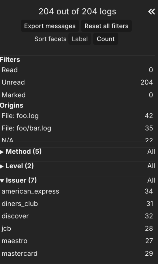 Now all facets are sorted either alphabetically or by the number of occurences. You can control that through controls at the top of the left column.