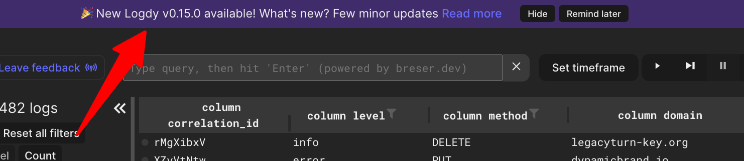 As a away to keep our users up to date with latest news on Logdy development we're now displaying a banner at the top whenever there is an update available. This functionality will not work when --no-updates flag is used. Read more in the docs.