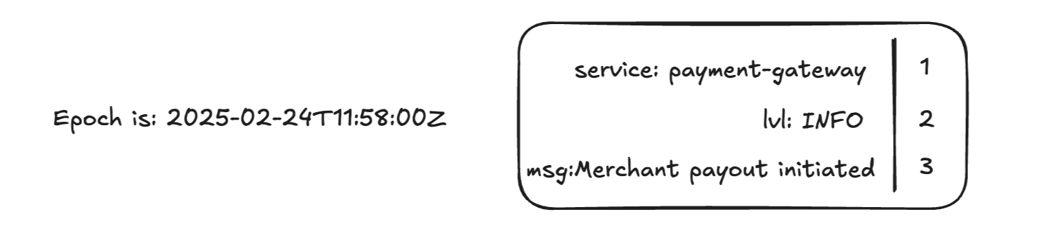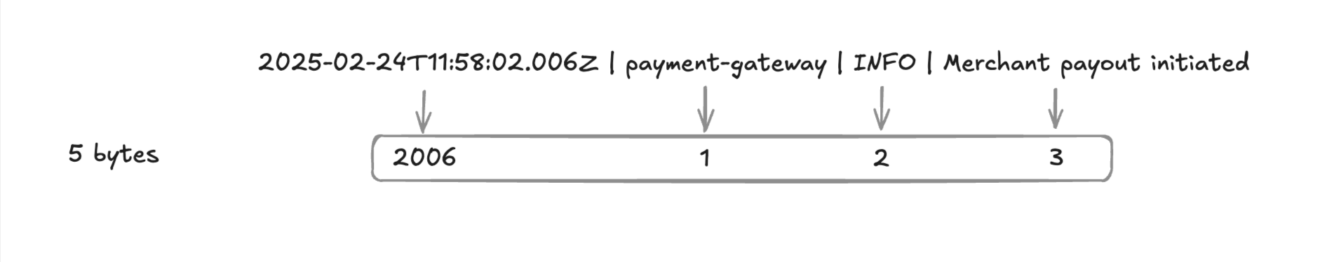 2006: Milliseconds since epoch (timestamp)1: Dictionary ID for "payment-gateway" (service)2: Dictionary ID for "INFO" (level)3: Dictionary ID for "Merchant payout initiated" (message)