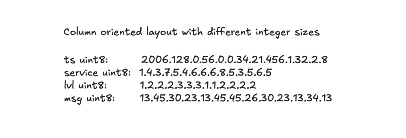 Rather than storing these numeric sequences row by row, Logdy Pro's log compression system organizes them in a columnar format for better compression efficiency: