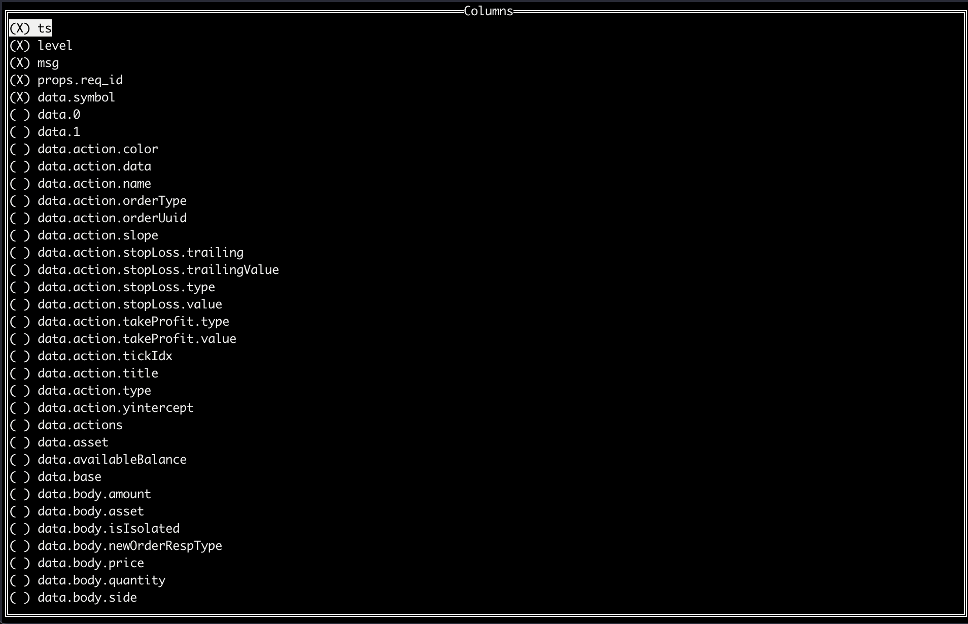 The LogdyPro log file navigator offers flexible column selection capabilities, allowing you to customize exactly which log attributes are displayed in your terminal view. Currently, you can select columns that correspond to actual fields in your logs, creating a tailored view that focuses only on the information most relevant to your analysis.