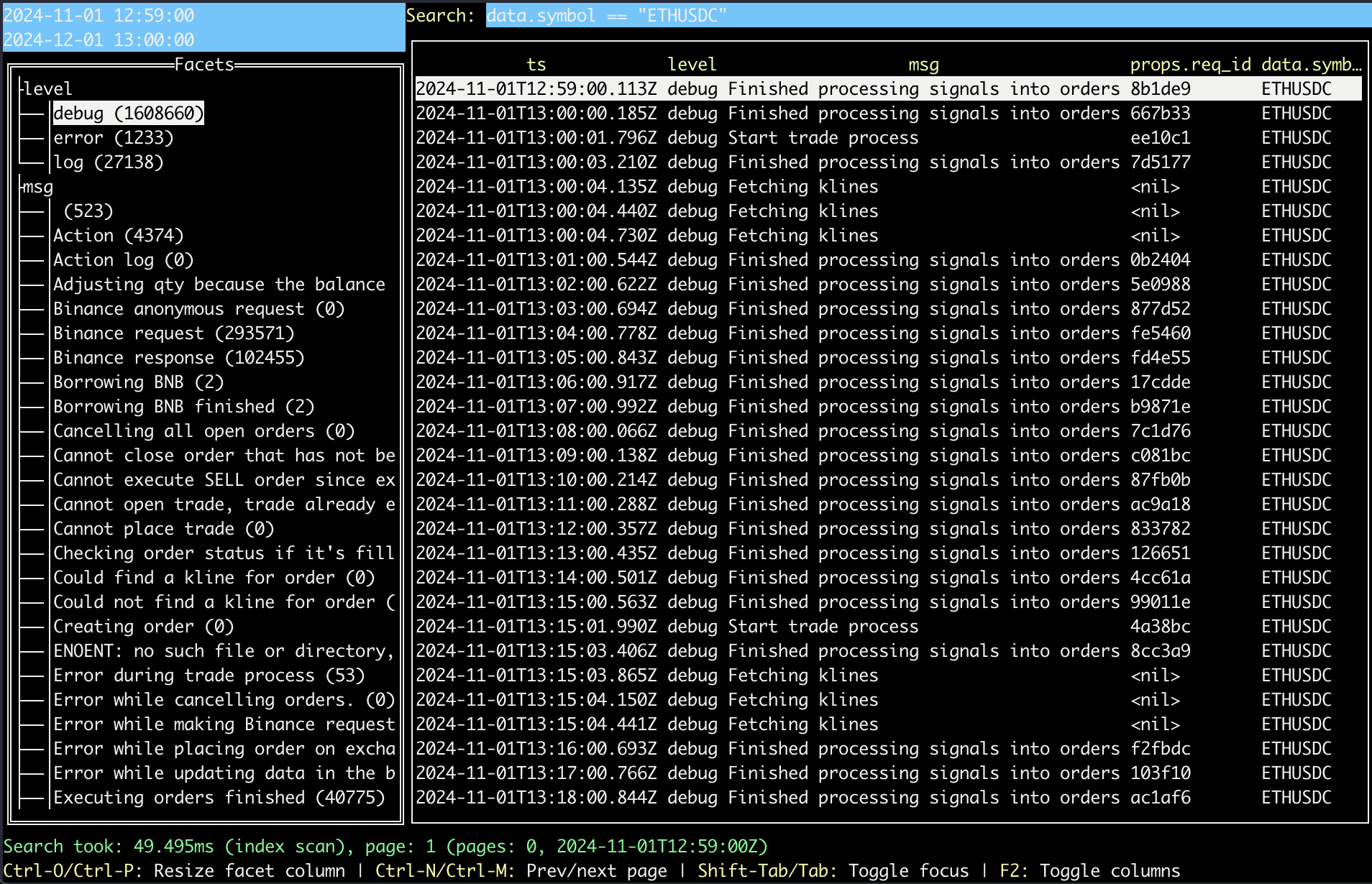 The terminal UI will be developed alongside a web UI which is also in the works. Below you can see a short video demonstrating the core features of our log file navigator in action.