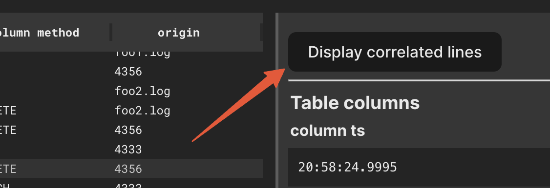 }Next, open a specific log message. If the correlation_id has a value assigned, a button Display correlated lines will be active. Clicking it, will filter all of the visible rows to only the ones that share the same correlation_id.