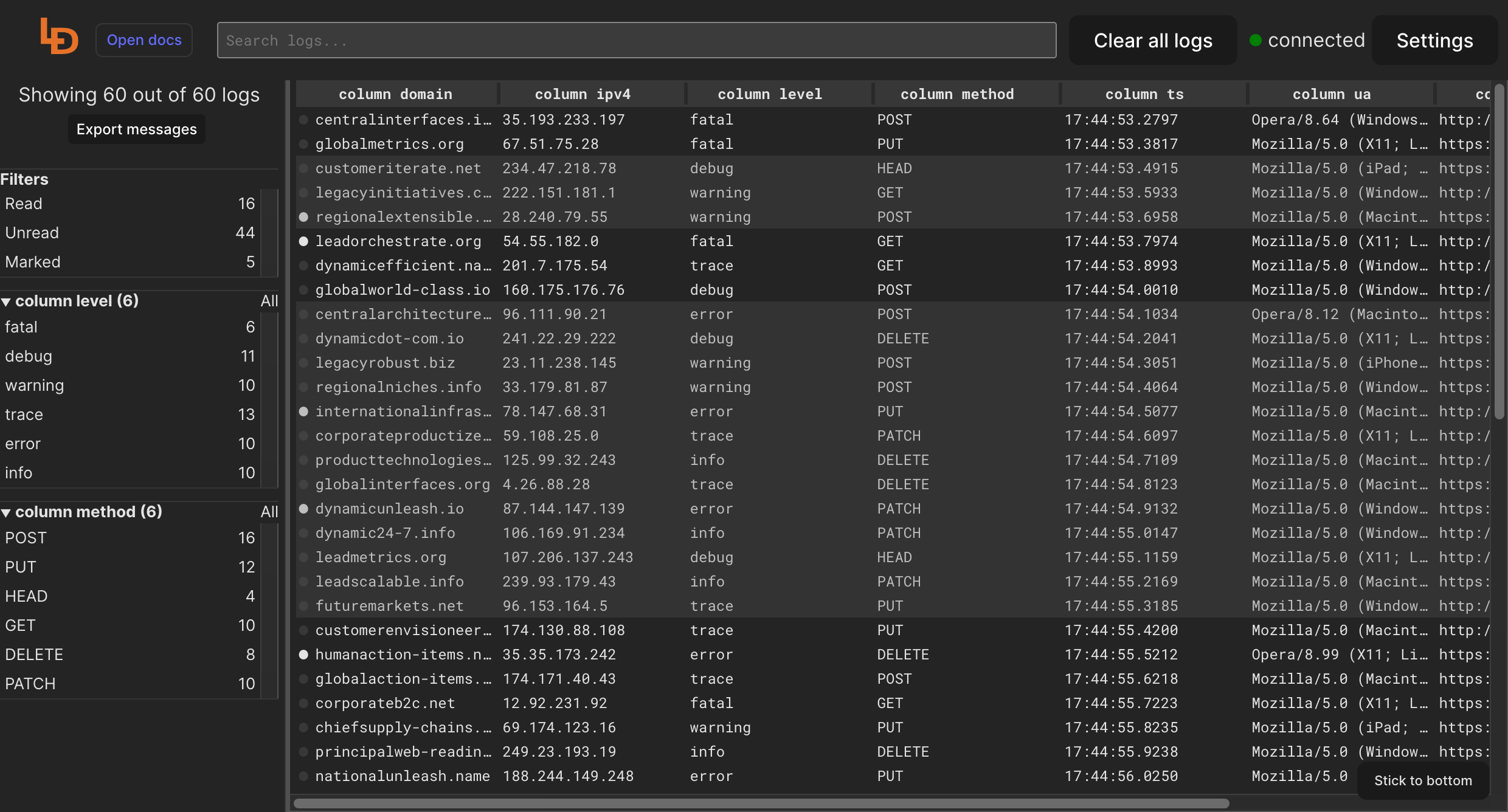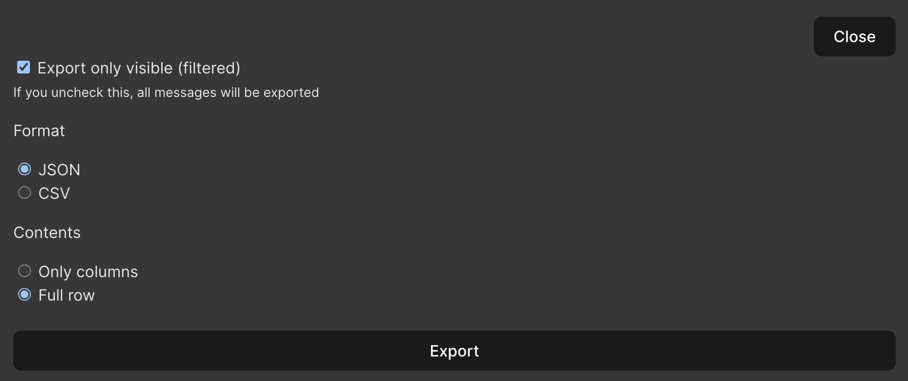 You can export log messages based on current visibility, in CSV or JSON format as well as select whether you want to export visible table columns or all of the field defined.